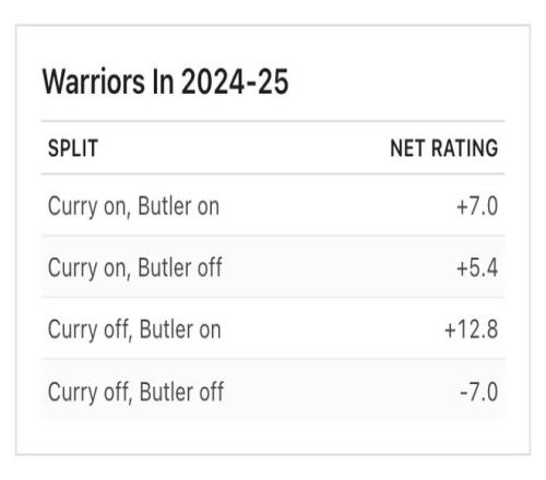 根据ESPN给出的数据,在上赛季的后半个赛季,当巴特勒来到湾区,勇士已经成了联盟最好的球队之一。在得到巴特勒之前,勇士的战绩为25胜26负,净胜分为-0.4;但从巴特勒首次亮相到常规赛结束,球队的防守效率排名第一,净胜分排名第三,每100回合能够净胜对手9.2分,球队在这段时间里打出23胜8负的战绩。根据ESPN的模型推算,如果换算到整个赛季,这支勇士有可能得到61胜。彼时,进入季后赛的勇士在首轮爆冷击败了西部二号种子火箭,并在与森林狼队的比赛中赢得第一场,如果不是因为库里腿筋拉伤,勇士甚至有可能走得更远。