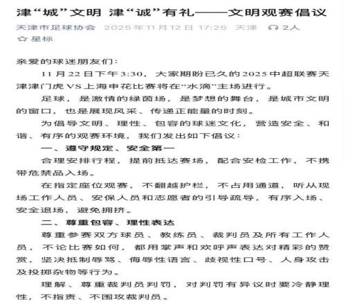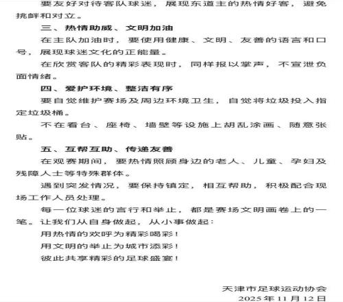 随后,天津市足球协会发布文明观赛倡议,希望球迷们理性观看中超联赛最后一轮天津津门虎将主场对阵上海申花的比赛。