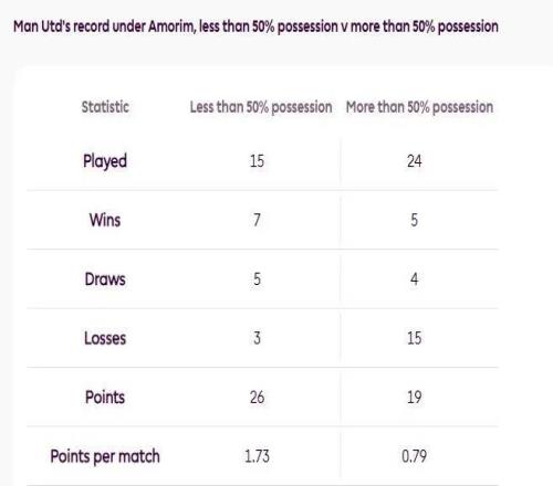 在英超联赛中,阿莫林执教的曼联控球率低于50%vs高于50%: