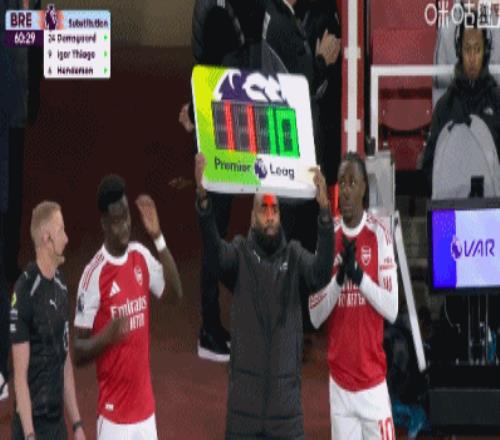 第61分钟,阿森纳换两人,萨卡和埃泽联袂登场